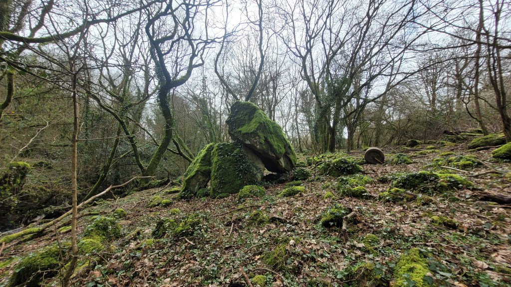But why vary between, lair, lodging and sty? Does it relate to legend or simply to what the cromlech have been used for in modern times… One, mundanely logical explanation for Gwal Y Filliast, is that the structure was simply used a kennel for greyhounds… So it was funny to see evidence of animal activity around the woodland, and what looks like a pig sty in the nearby field.. could there simply be a long tradition of keeping pigs at this location?