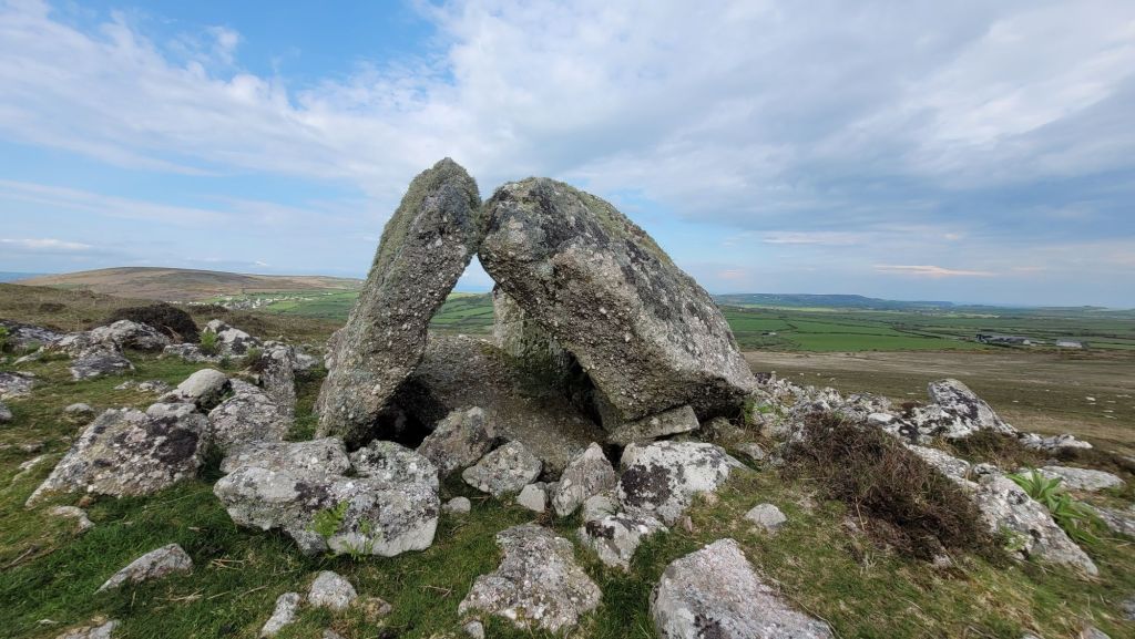 The northern of the two is the slightly better preserved.. It stands upon an oval shaped mound which is a cairn measuring roughly 60 feet by 42 feet though now in a ruinous condition. However, the condition of the “chamber” is reasonable. Two uprights support a capstone that has fallen on it’s side. In the middle there is a fallen upright stone and a smaller recumbent stone. There are slight traces of a kerb and also a few outer stones still stand close by. – https://thejournalofantiquities.com/2013/05/23/sweynes-howes-rhossili-gower-peninsula-wales/