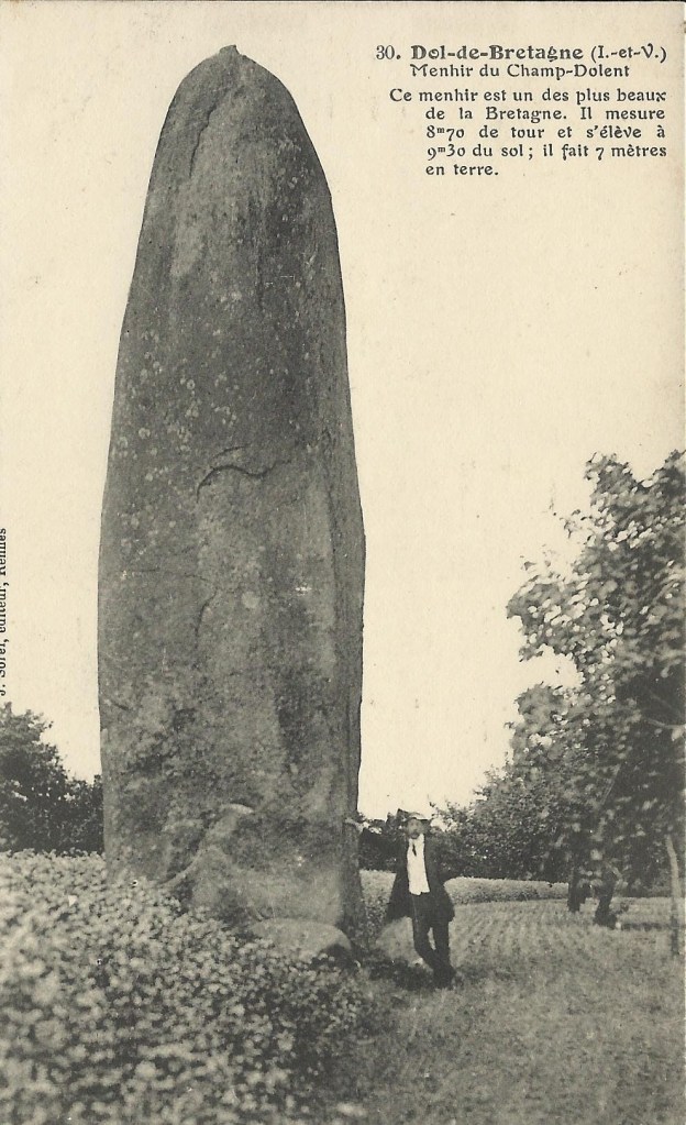 “It is a quarter of a league from the city that you must go to find the famous stone of Champ-Dolent. Does this name remind us of human sacrifices? My guide gravely tells me that it was placed there by Caesar. Was it once in the middle of the forest? Now it is in the middle of a cultivated field. This menhir is twenty-eight feet high and ends in a point; at its base it has, according to my measurement, eight feet in diameter. All in all, it is a block of grayish granite whose shape represents a slightly flattened cone. It should be noted that this granite is only found more than three quarters of a league from the city, at Mont-Dol, a hill surrounded by marshes and which was probably once an island. The stone of Champ-Dolent rests on a quartz rock in which it sinks a few feet. By what mechanism were the Gauls, whom we imagine to be so little advanced in the arts, able to transport a mass of granite forty feet long and eight feet thick? How did they erect it?”