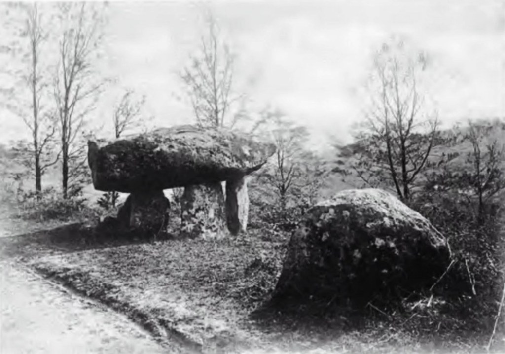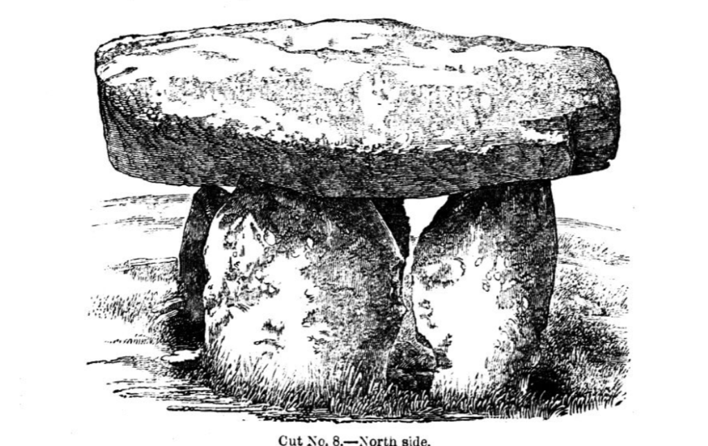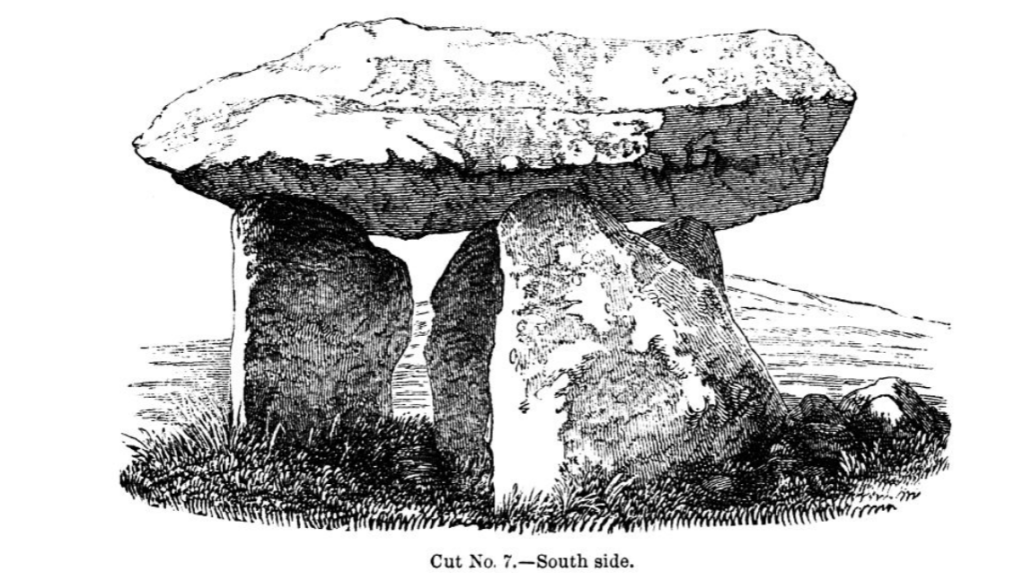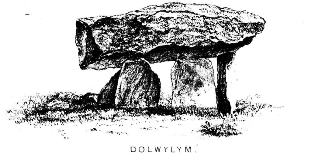 “One of the most perfect and interesting dolmens in Wales stands in the grounds of Dolwilym, in the northern extremity of the parish of Llanboidy, in Carmarthenshire. The spot in which it is placed commands a singularly picturesque view of the vale and river of Taf, and is about midway down the steep slope on the right side of the river. Originally the chamber consisted of five or rather six stones, although only four now remain. The fifth, now missing, filled up the empty space at the south-west angle ; and in all probability there was a second small stone at the eastern end, as the one now there could not, from its shortness, have closed that entrance.