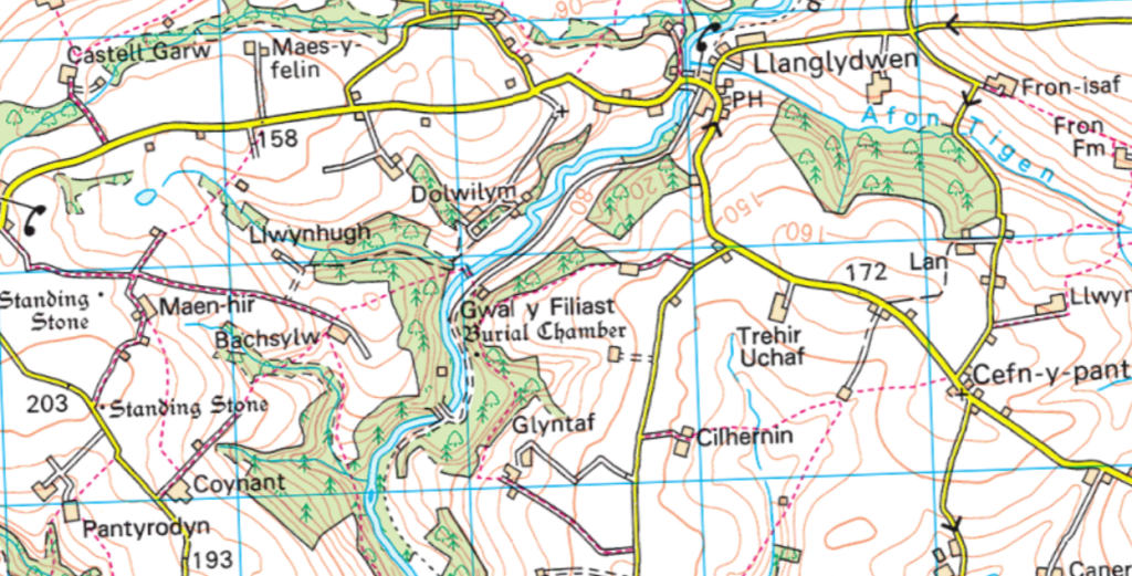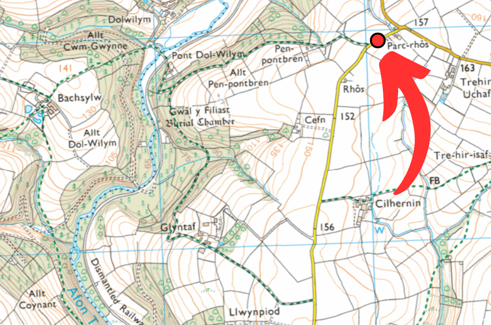 The commonly used route to Gwal y Filiast is accessed by parking in the layby we’ve pointed out on the map. Then simply follow the footpath through the woodlands to the cromlech. As you almost reach the cromlech, the path splits.. Stick to the left path to reach Gwal y Filiast..