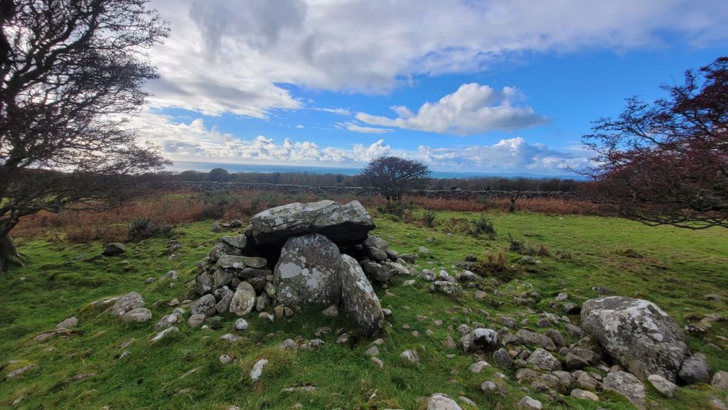 This cromlech is situated in the old parish of Llanddwywe. Its a beautiful site with stunning views of Eryri and Bae Ceredigion. The name Cors y Gedol comes from the 16th century manor house nearby, who’s estate would have once covered a larger area of land here. Some old records of this monument also refer to it as Arthur’s Quoit, or Coetan Arthur.. Names given to many neolithic monuments around Wales.