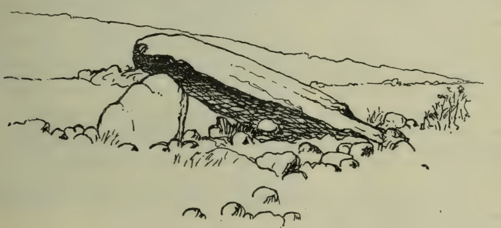 “A little above Corsygedol mansion is a third cromlech, of which a representation is here given from a most accurate drawing by Miss Colville of Corsygedol. Here are also the remains of the carn that once covered it. The capstone has been dislodged, so as to leave one end resting on the ground ; but even when in position, the cromlech must have been somewhat lower than usual, and certainly of moderate dimensions. Little can be made out of the original chamber, except that it stood east and west.