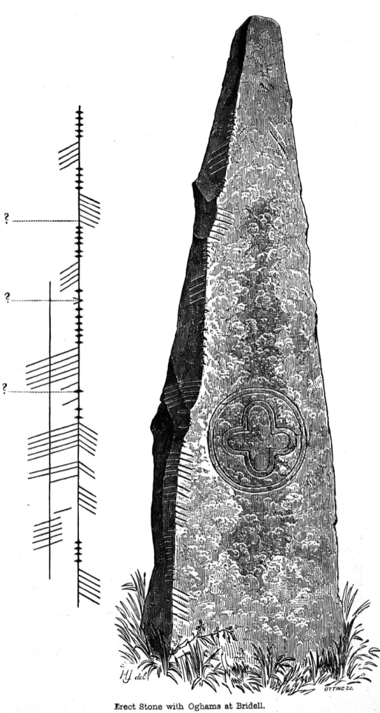 “..Mr. Jones gives, with his illustrations, a scheme of what he believed the characters on the stone to be, in relation to its angular formations ; but if we refer to his pictoral engraving, which has all the appearances of truthfulness, it will not bear out the scheme, which also renders the inscription confused and unintelligible. That there are difficulties connected with the inscription is undeniable, arising from two causes, – the prolongation of some of the upper and crossing consonants to an angular projection on the eastern face of the stone giving some countenance to Mr Jones’ idea of a second line of inscription ; and the wearing and partial obliteration of some of the characters on the main angle. Regarding the first, I should say there was no second angle, and no second line of inscription intended. The characters are generally boldly cut, perhaps unusually long, -the prolongation of the consonants being a mere freak of the engraver. Several Irish inscriptions present us with examples of very long scores done in the dashing style of those on the Bridell stone.
