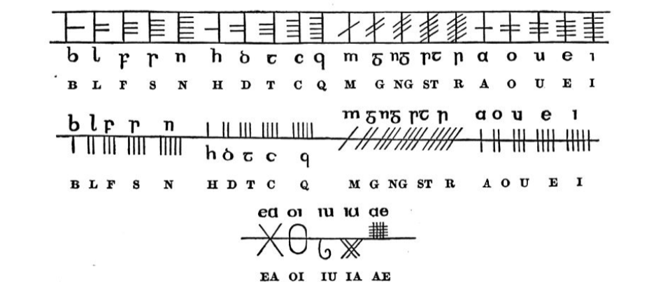 An illustration, reduced from several accurate drawings and rubbings, from sketches, from repeated handlings, and from minute examinations made during several successive years, is here annexed ; but, though it is hoped that due fidelity of delineation has been attained, it is much to be wished that a careful cast of this stone should be taken, and that copies of it should be submitted to the inspection of Irish antiquaries, if needed they still feel disinclined to come and see for themselves these ancient stone records of the sister isle. We dwell on this circumstance because there are many peculiarities to be observed in the Oghams on this stone ; and because, even with the aid of Professor Grave’s alphabet, which we here again append, this inscription has not been hitherto satisfactorily deciphered. A single cut occurs on the face of the stone near the upper portion ; and it will be understood that the Oghamic marks are made darker than they actually are in order to catch the eye more decidedly.