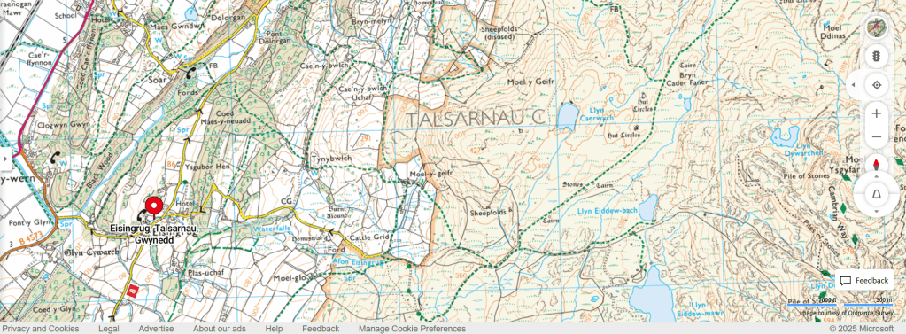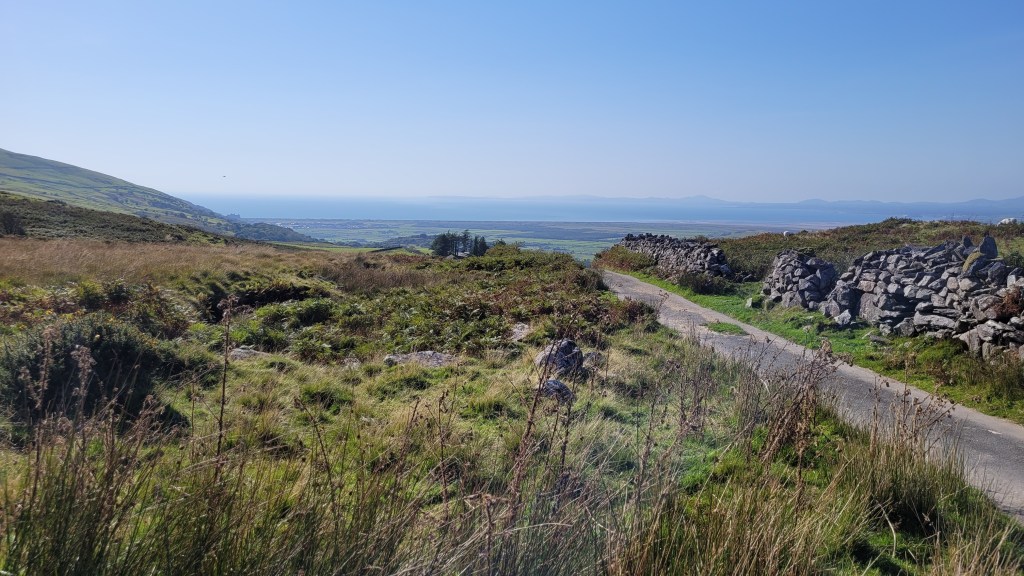 To access Bryn Cader Faner, we parked at the end of a mountain track above Eisingrug, where there is a small parking area with a donations box. The view from here is amazing, with Harlech Castle silhouetted at the coast in the distance..