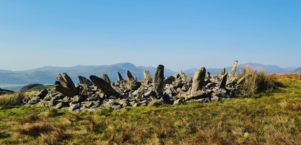 Bryn Cader Faner is made up of a low stone mound, approximately 8 meters in diameter. Around the edge is a ring of tall thin slabs set at an angle, projecting from the mass of the cairn like the rays of the sun.. or perhaps thorns of a crown..