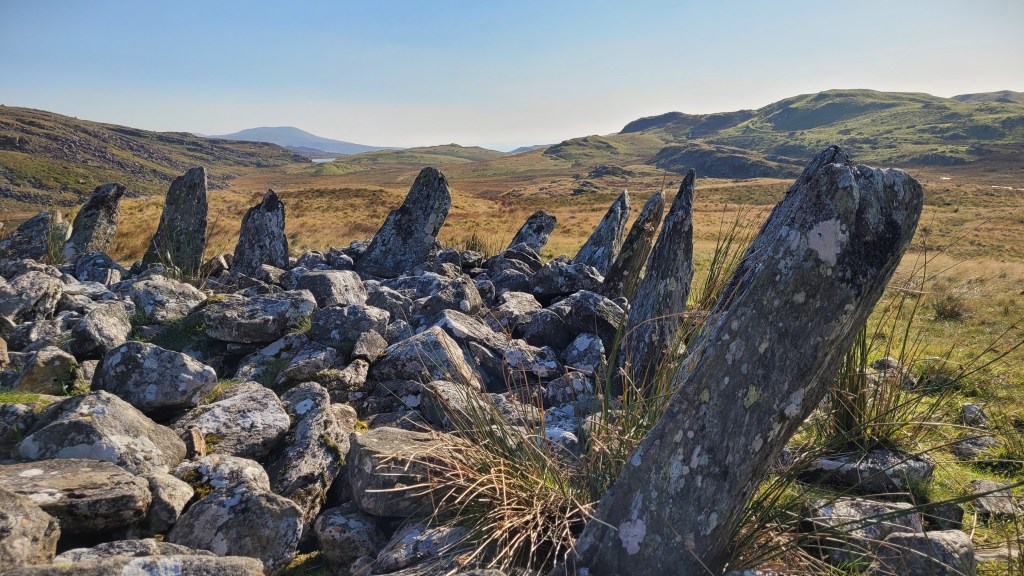 “The existence of stone circles elsewhere impelled people to place tall stones around the bases of their own round cairns, a fusion of traditions resulting in monuments like spiky coronets. Such cairns may be seen on North and South Uist, and in Wales at Carn Llechart, Glamorgan, and Bryn Cader Faner, Merioneth..
