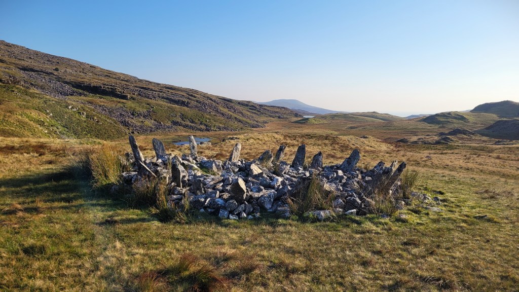 On the path descending north west from Bryn Cader Faner are the hut circles of Moel Geifr and a group of cairns below Y Gyrn. The most westerly is 33m in circumfrence. A ring of stones extends for around 2m from the central mounds. As at Bryn Cader Faner, they are set at a 45degree angle, pointing radially outwards. A little further up the stream stands a second cairn, Y Gyrn with two concentric rings; a large collapsed central cist is clearly visible. A slab lying nearby probably once stood upright. A third cairn lies 30m to the NE on the bank of the stream. ‘