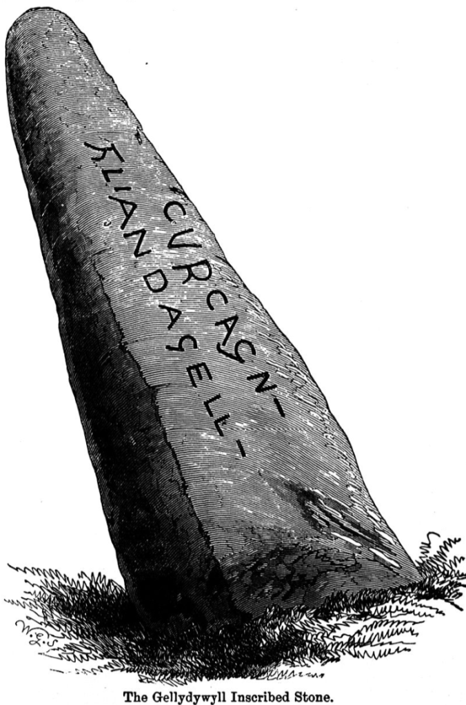 “The Gelli-Dydywll Stone – Curcagni fili Andagelli – “On a stone 6ft long on the roadside by Mr. William Lewis’s house, called Bwlch y clawdd, in ye parish of Maen Clochog, in Pembrokeshire, I found this inscription A.D. 1743”. In a notice of this inscription in the Gent. Mag. For 1776, it is said that the stone then stood on the lawn of Capt. Lewis’s house in Carmarthenshire.” – https://journals.library.wales/view/2919943/3010814/65#?xywh=-931%2C219%2C4349%2C2264