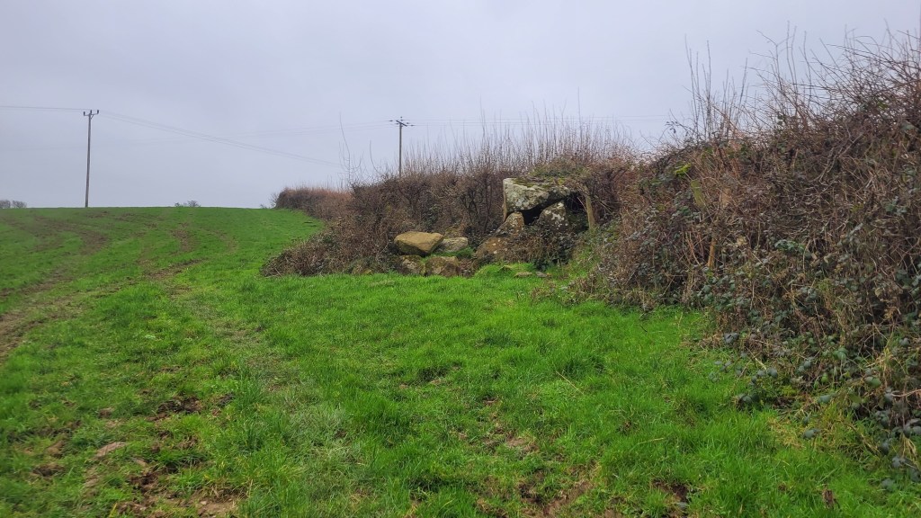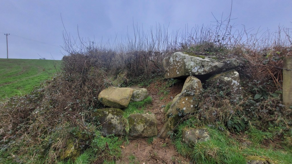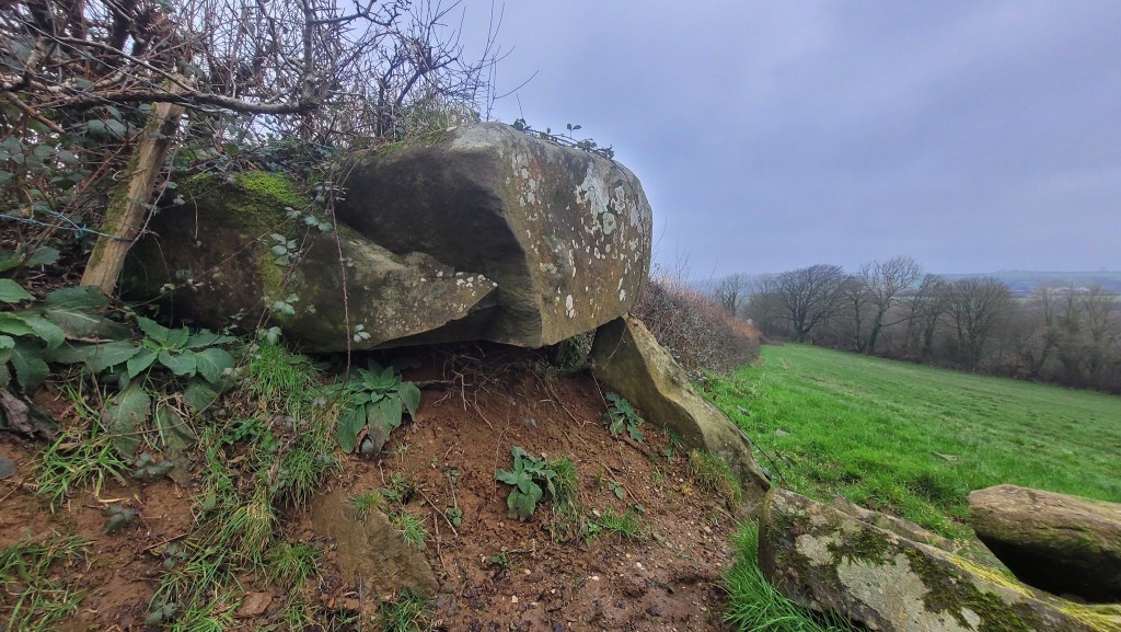 ” The remnants of this monument lie on the N side of a hedge, on a slope which overlooks a stream to the N. The capstone has two large supporters remaining at the front of the chamber, while the tip of a back-stone protrudes through the chamber filling. This is likely to be mostly modern silt, for a local resident recalls playing in the chamber as a child (Stenger in DAT DRF).