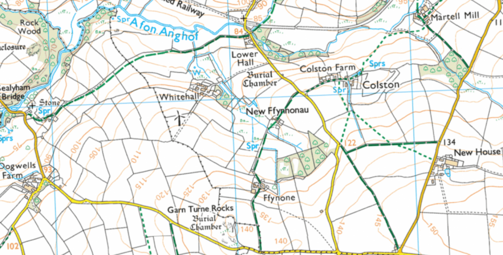 Today this cromlech lies in ruin in a field boundary near Little Newcastle in Pembrokeshire. There is a short Coflein entry: “Colston Burial Chamber. A burial chamber consisting of a capstone, 2.0m by 2.0m by 0.6m, resting on two upright stones and set upon probable barrow, 30m in diameter. Up to two other burial chambers have been suggested here, however the only other stones noted in 1966 were thought to be related to field clearance.”