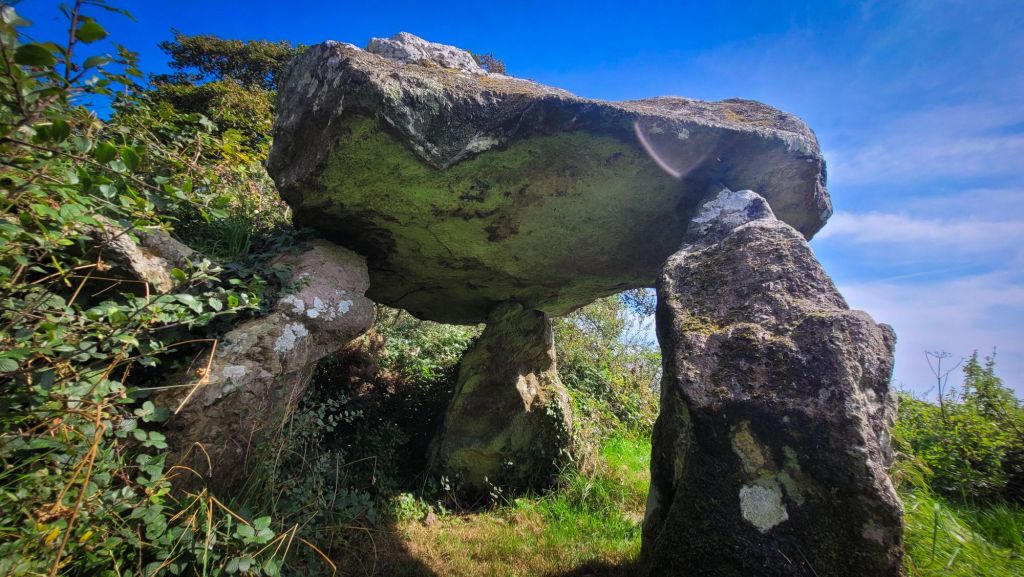 This beautiful Cromlech sits in a field overlooking Abercastle Harbour and the Irish Sea. It’s fat, rounded capstone is perched on only three out of the six large upright stones. The structure is estimated to be around 5000 years old. Modern christianised legends says the capstone was lifted into place by a St Samson, using just his little finger.