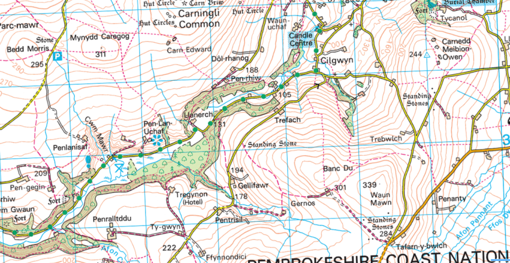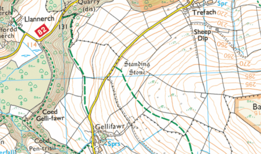 We parked on a grassy verge on the side of the road between Trefach and Gellifawr, close to the entrance to the field. The stone can be seen on the road and there is a public footpath leading right up to it.