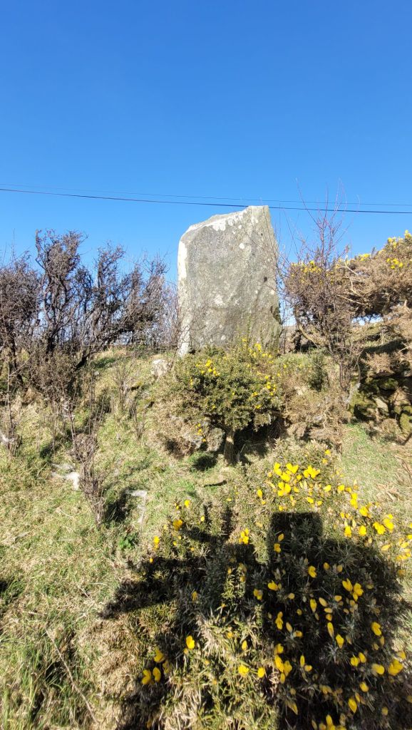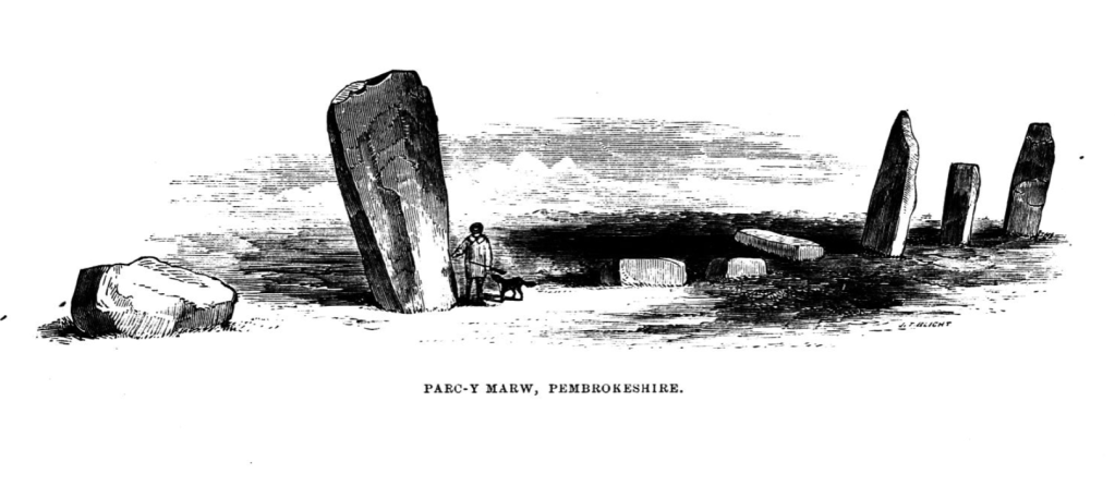 In 1868, Edward Barnwell writes in Archaeologia Cambrensis: “In the northern part of Pembrokeshire is a single line of stones of great size, which Fenton does not mention, although he deliberately pulled to pieces a fine cromlech near it, and which seems to have been connected with this row of stones, for it was probably continued further northwards than it is at present. On referring to the Ordance map, a little to the right of the word “Llanlawer”, will be seen the position of the line called in the map “Parc y marw” (field of the dead); and a little further to the east, but slightly to the north, is marked down the cromlech destroyed by Fenton, and of which only some small fragments remain. The line of stones is parallel to the narrow road, and if continued would pass within a few paces of the ruined cromlech.
