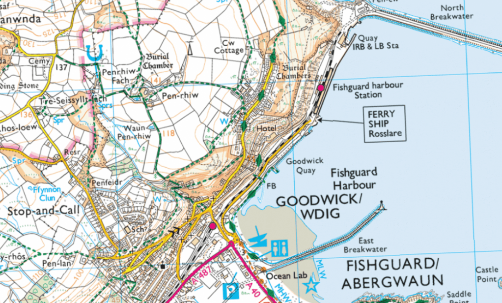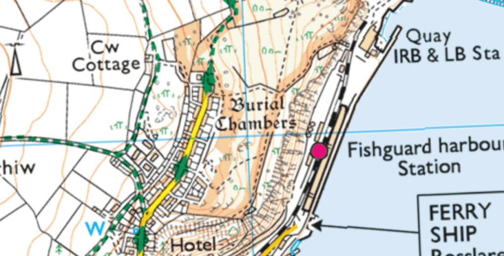 “The three chambers lie on the eastern side of a deeply fissured rock outcrop, high above the sheltered bay that is now Fishguard harbour. The northern chamber consists of a capstone resting upon a thick fallen slab, with a further small stone trapped beneath. At the middle chamber two large fallen stones underlie the SW edge of the capstone, with another displaced slab a metre to the W. Three small slabs remain (in situ) beneath the capstone – their original function is unclear, for they are rather low and slight in comparison with the fallen uprights.