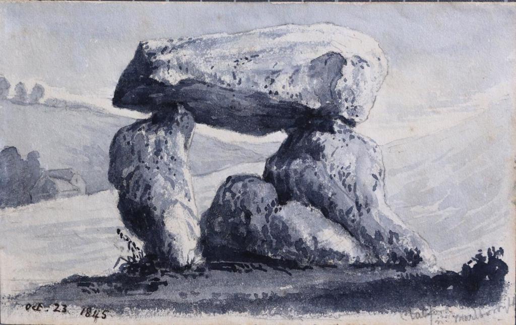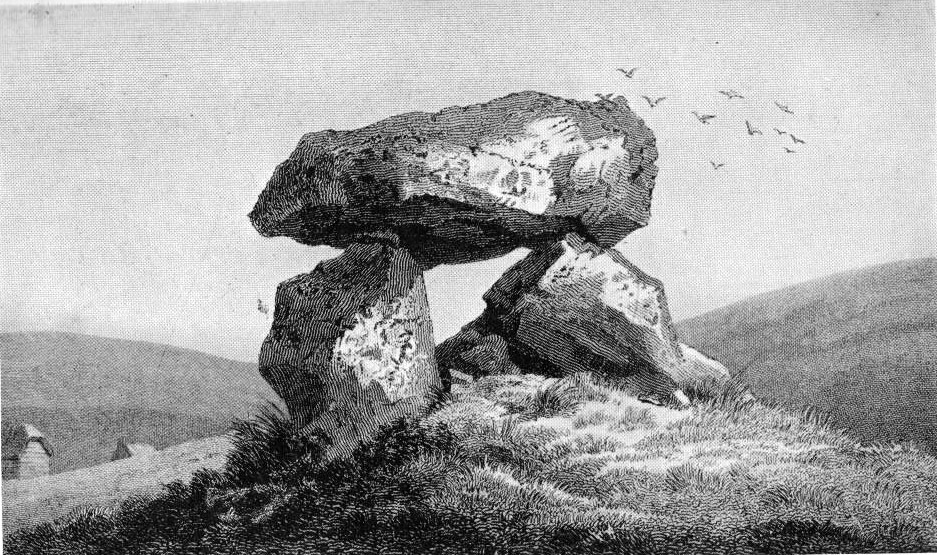 There are various traditions connected with it. I was told some years since, by an old man hoeing turnips near, that if anybody mounted the top of it, he might shake it in one particular part. I do not know whether this is the case or not, though it is not unusual where the capstone is upheld by only three supporters. But another laborer whom I once interrogated informed me that nobody could ever pull off the capstone ; that many had tried to do so without success ; and that on one occasion twelve white oxen were provided with new harness, and set to pull it off, but the harness all fell to pieces immediately! As my informant evidently thought very seriously of this, and considered it the work of enchantment, I found it was not a matter for trifling to his honest but superstitious mind ; and he remained perfectly unconvinced by all the arguments with which I tried to shake his credulity.