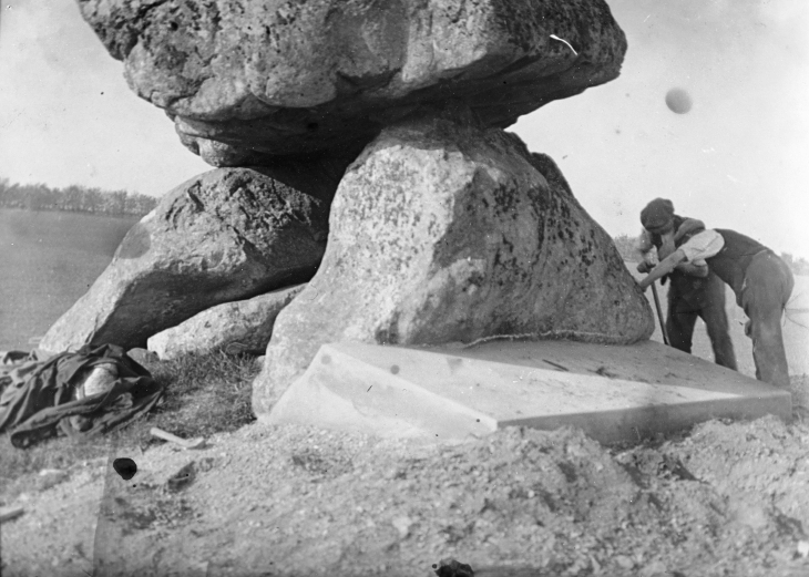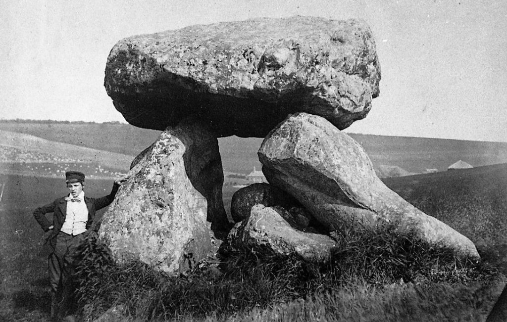 In 1921, Arthur Dennis Passmore led excavations at the site and concrete was then added around the base of one of the upright stones, in an attempt to keep the monument standing. Mr Passmore described the remains of a barrow 230 feet (70 meters) in length. He estimated the capstone to weigh around 17 tonnes. There are also cupmarks on the capstone.