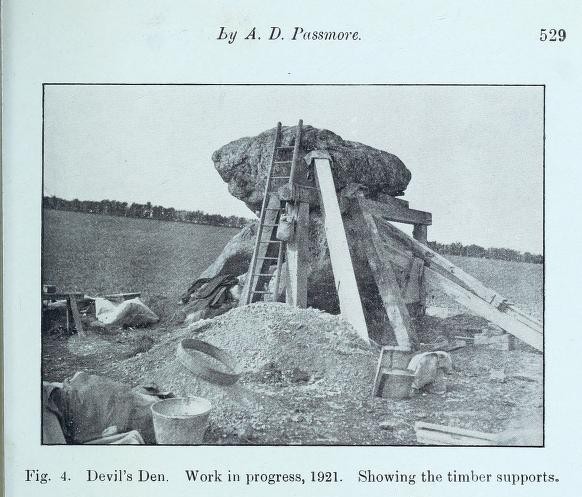 Owing partly to the continual ploughing away and leveling of the ground immediately surrounding it, this well known dolmen, showed signs of probable collapse. The Wiltshire Archaeological Society having sought the advice of the Chief Inspector of Ancient Monuments in the matter, an expert from the Office of Works met representatives of the Society and a local contractor on the spot, and gave detailed instructions for the concreting of the base of the main supporting stone which threatened to give way. This involved the shoring up of the structure whilst the necessary excavations were made, and the work now completed has proved more expensive that had been expected. To pay for this (£54) the Wiltshire Society is now raising a special fund. The excavations were carefully watched and examined on behalf of the Society by Mr. A. D. Passmore, but nothing whatever was found. The ground has been long under the plough, but indications of the long barrow of which the dolmen originally formed a part are still to be seen.” – https://archive.org/details/antiquariesjourn02sociuoft/page/60/mode/1up?q=devils+den&view=theater