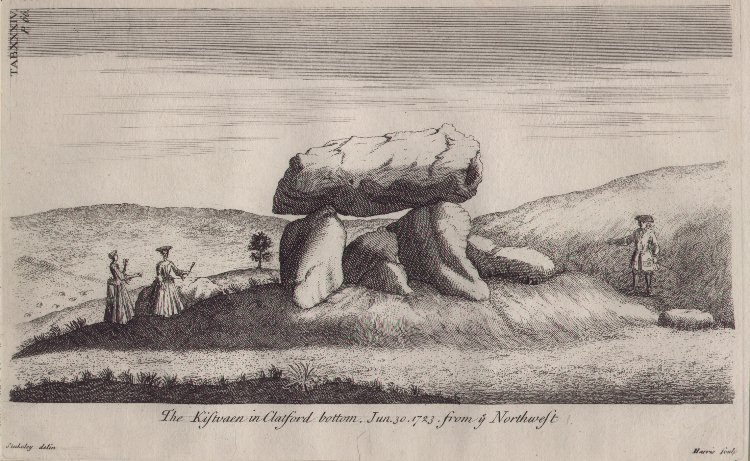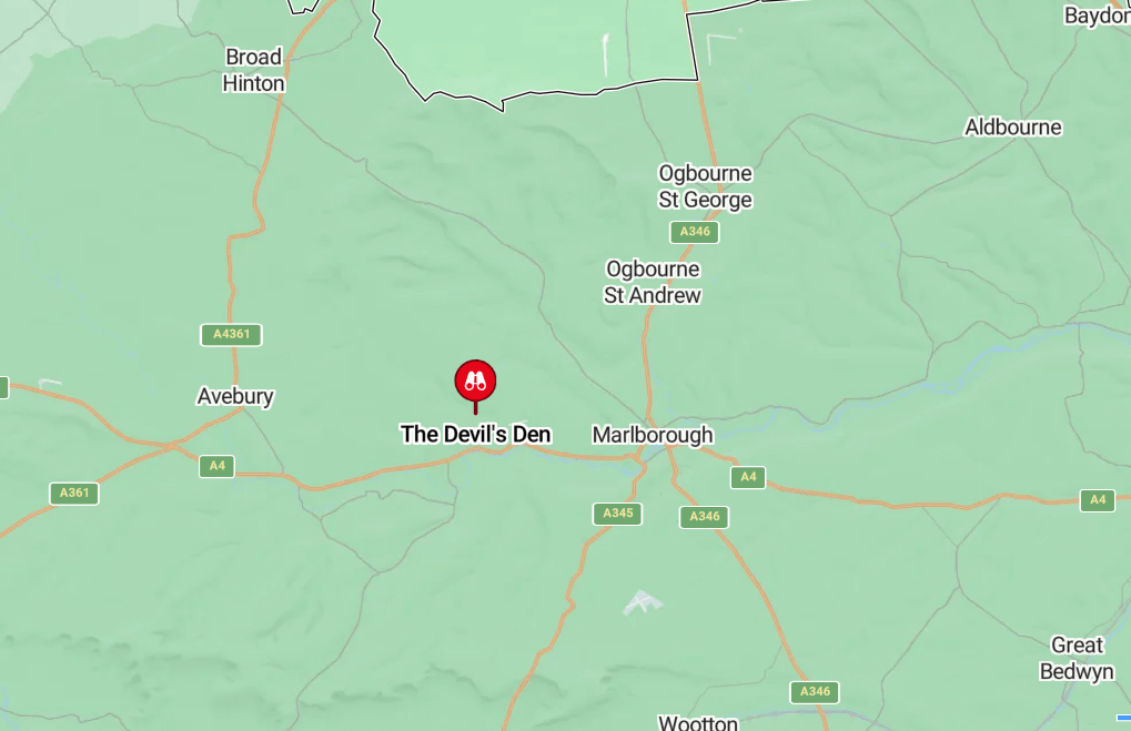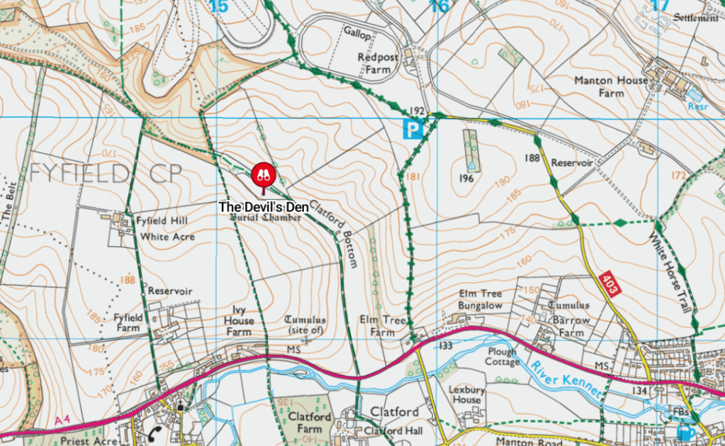 Stukeley says very little of this kistvaen, though he gives several plates of it, his only remark being: “An eminent work of this sort in Clatford Bottom, between Abury and Marlborough.” Sir R. Hoare (in Ancient Wiltshire, North) is more enthusiastic, he says: “From Marlborough I proceed along the turnpike road as far as the Swan public house in the parish of Clatford, and then diverge into the fields on the right, where, in a retired valley amongst the hills, is a most beautiful and well-preserved kistvaen, vulgarly call’d the ‘Devil’s Den.’ It has been erroneously described as a cromlech. From the elevated ground on which this stone monument is placed, it is evident that it was intended as a part annexed to the sepulchral mound, and erected probably at the east end of it, according to the usual custom of primitive times.” – https://babel.hathitrust.org/cgi/pt?id=mdp.39015023917472&seq=241&q1=devil