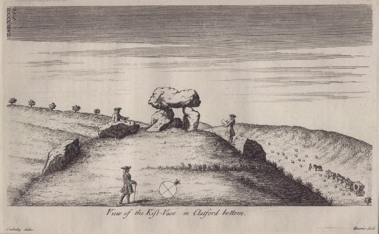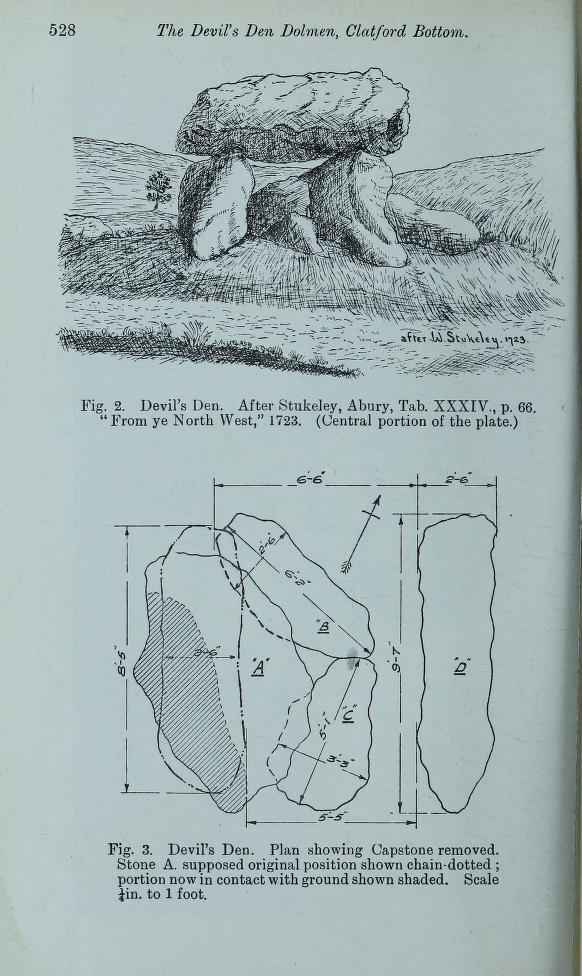“On the N. side of the Kennet Valley opposite to Clatford a small valley (Clatford Bottom) runs to the NW. At the mouth of this valley and south of the river, formerly stood the curious circle formed of eight huge and roughly hewn stones seen by Aubery and Stukely, the sketch made by the former being reproduced by Long. 920 yards North of the river and in the abovementioned valley stands the dolmen known as The Devil’s Den. Nearly due North of this and 2100 yards distant stands another dolmen of the same class on the east end of a long barrow, at Dog Hill, Manton ; while in almost the same line to the North formerly stood the Temple Bottom Dolmen at a distance of 1210 yards. Thus, in a N. and S. line under two and a half miles long, four important megalithic monuments once existed.