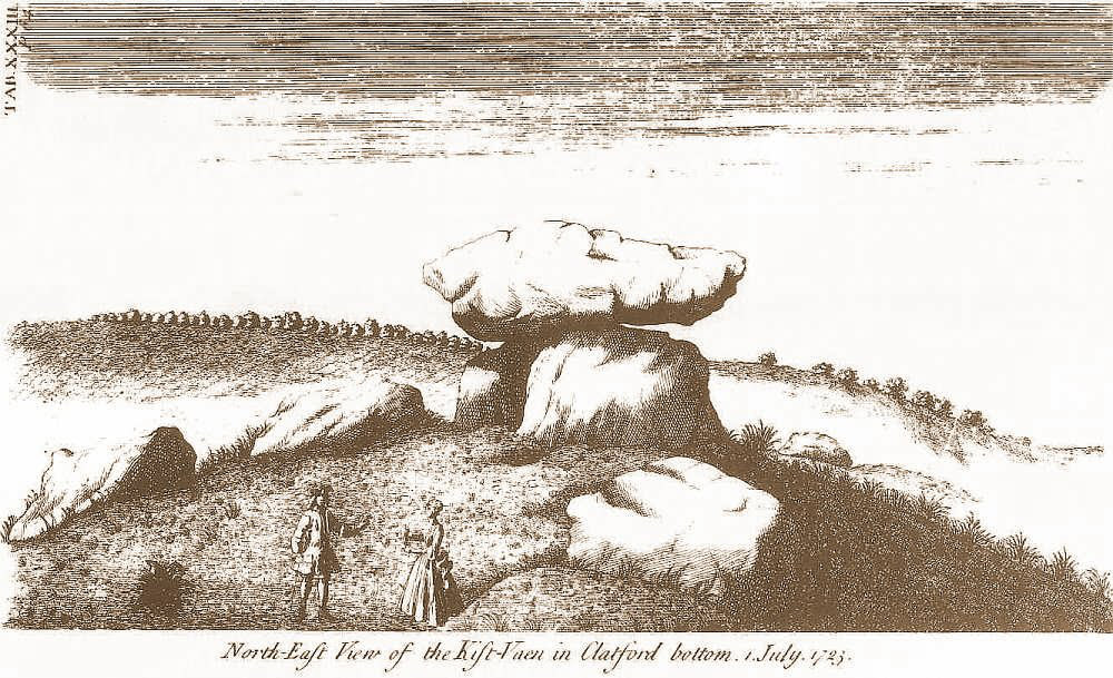 Here are some illustrations of the site provided by William Stukely in 1723 which show what many believe to be a long barrow with several large stones which are no longer in sight. He refers to it as “Kist-vaen in Clatford Bottom”.