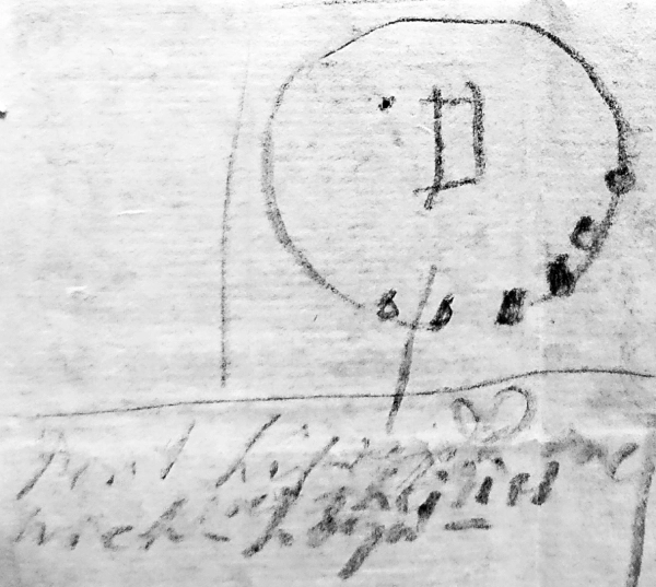 Above: A plan of a circle with six stones appears on the back of an undated letter drafted by Iolo. The first few words appear to be Pont Herwydd one arch, Ponterwyd a settlement just over a mile north. Although the note book does not mention Ysbyty Cynfyn, it lists Devil’s Bridge and Hafod as two of the places Iolo Morganwg passed through between Aberystwyth and Rhayader. The draft letter relates to visiting the homes of those who had old documents worth copying – the task Iolo was commissioned to do for Owen Jones (Owen Myfyr) in 1799 and 1800. It seems likely that this note and plan dates to 1799.