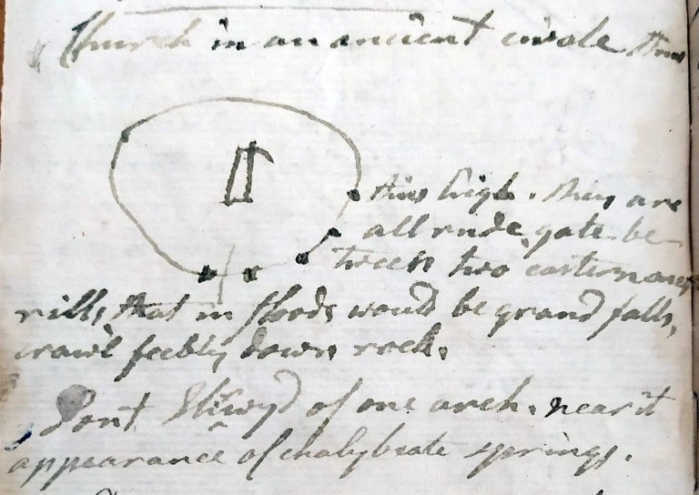 “Walk over Hafod grounds with E & B, visit Parsons Bridge, Church in an ancient circle stone ?this high [i.e. ?the stone nearest ‘this’ is the highest], they are all rude, gate between two eastern ones rills that in floods would be grand falls crawl feebly down rocks. Pont ?Stirwyd [Erwyd] of one arch, near it appearance of chalybeate springs.” From Iolo’s notes Williams, Edward, (Iolo Morganwg), Journey 3 Llandeilo to Cardiganshire and the north, c. 1800