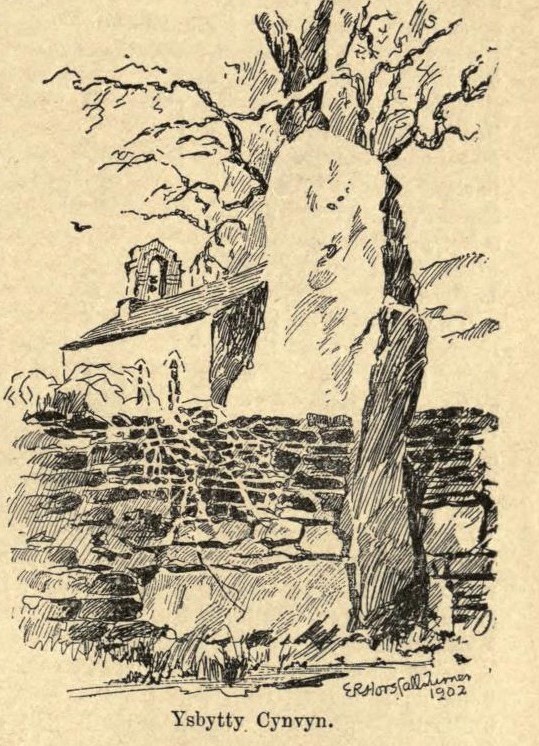 “There are in the churchyard a large, upright stone monument, with the characters entirely defaced. I could not learn that any tradition was attached to them in the neighbourhood; and there was nothing in their shape or appearance, particularly to distinguish them from similar erections, to be met with in every part of this country. I have from numerous appearances in Wales, as well as from a great many passages furnished to me by my literary friends in old Welsh writers, whether historians or poets.. been fully persuaded that the first British Christians used the Druidical places of worship in the open air, within large circles of stones, like those of Stone Henge, and Rollrich, or as some call it Rollright, in Oxfordshire. The church and church-yard of Yspytty Kenwyn may be adduced as an instance of this. The church has been built within a large druidical circle or temple. Many of the large stones forming this circle still remain; and the fence around the church-yard is filled up by stone walling in the intermediate spaces.”
