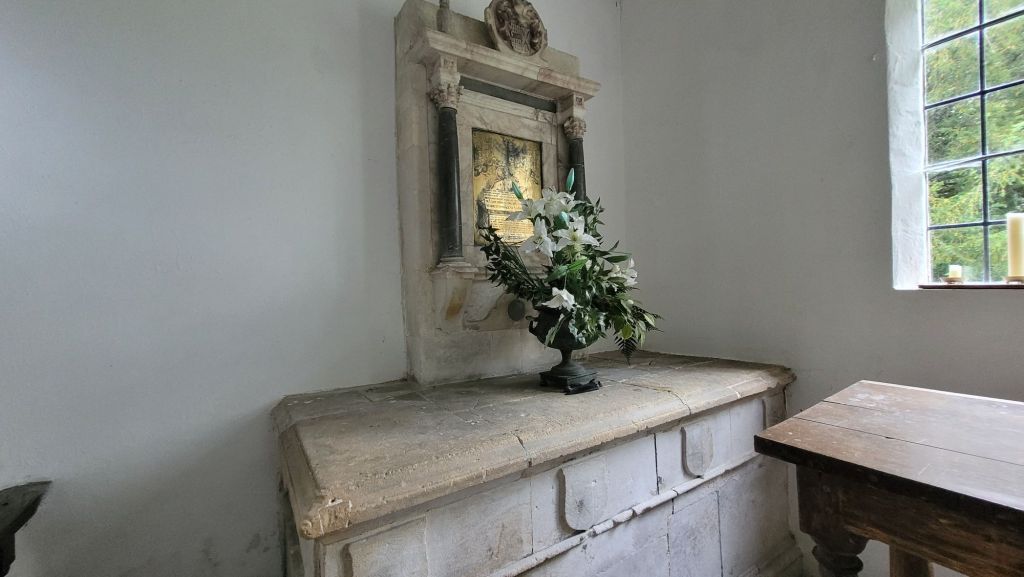 On the north side of the chancel, a 16th-century tomb-chest surmounted by a monumental brass commemorates landowner William Button (died 1591), great-grandson of John.