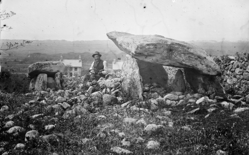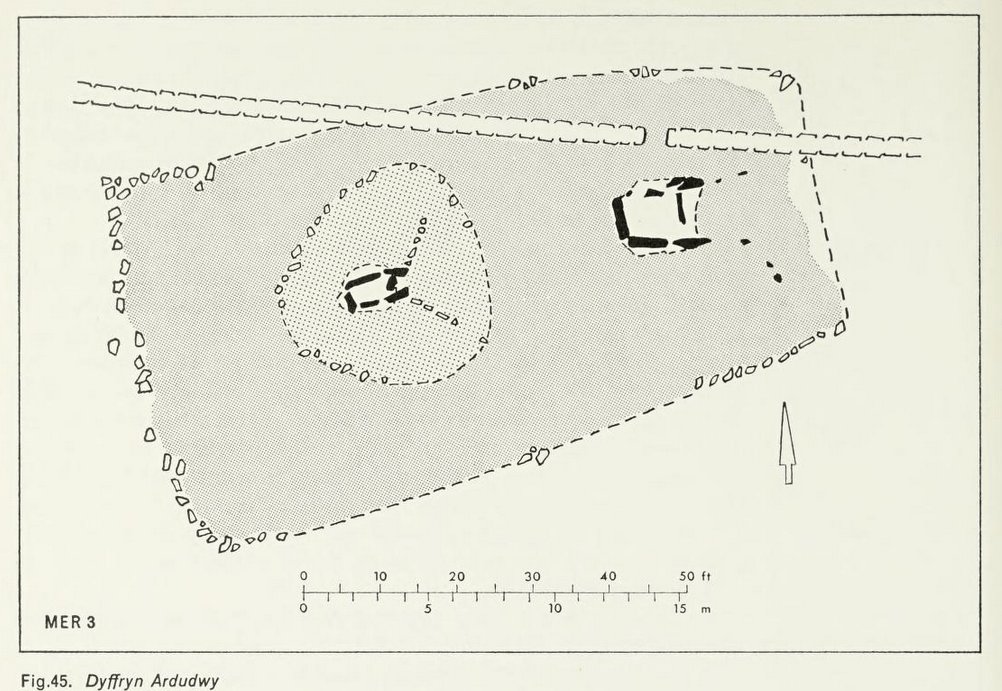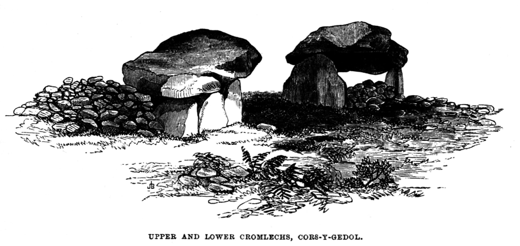Both in the field in which are the cromlechs, and in the adjoining one, innumerable carns and remains of carns, which extend down the slope nearly to the seashore. A reference also to the Ordnance Map of the Vale of Ardudwy, from Barmouth to the Two Traethau, will shew, from the number of cromlchs, and fortified posts (and there are many of the latter not given), that the whole district must have been densely inhabited at a very early period. Even after the destruction of such monuments, which has been going on for centuries, the number of those remaining, especially the cromlechs, is remarkable ; so that there are, perhaps, few parts of the Principality where they are to be found in equal numbers and importance.” – https://journals.library.wales/view/2919943/2998546/36#?xywh=-330%2C-21%2C3385%2C3522