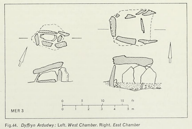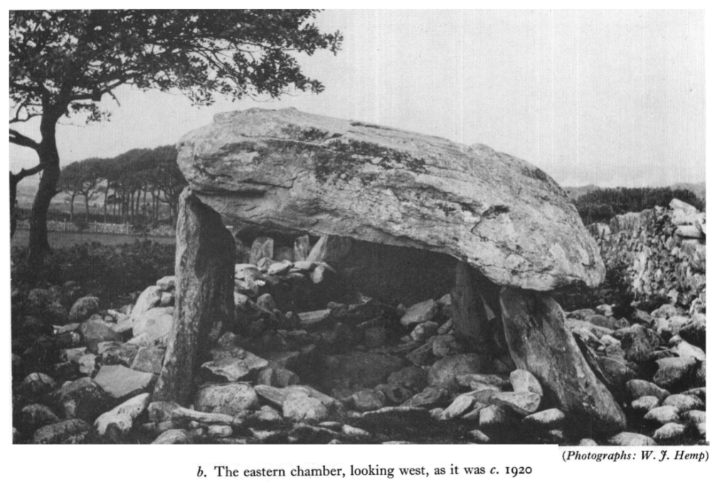 In the writers opinion the East Chamber is not the work of people influenced by foreign ideas. It appears to be an adapted form of the Portal Dolmen, one in which the high portal stones and the closing slab have become less important, but in which the essential ideas of demarcated portal and blocking remains. The contrast, too, between this roughly made cairn and the carefully built long cairns higher on the hills, at Carneddau Hengwm is surely significant.” – https://archive.org/details/megalithicenquir0000unse/page/136/mode/1up