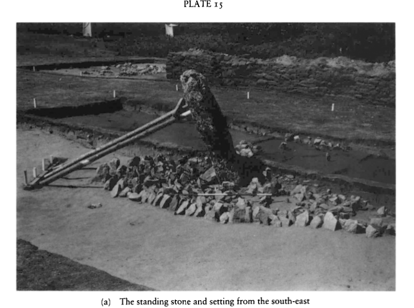 The standing stone was shown to have been erected on the site of a circular timber structure which burnt down around 3,400 years ago and was part of a complex setting of small stones. Human cremation was inserted into the complex around 940BC and a later Iron Age and Romano-British settlement (or ‘ritual’) site was also found and recorded.