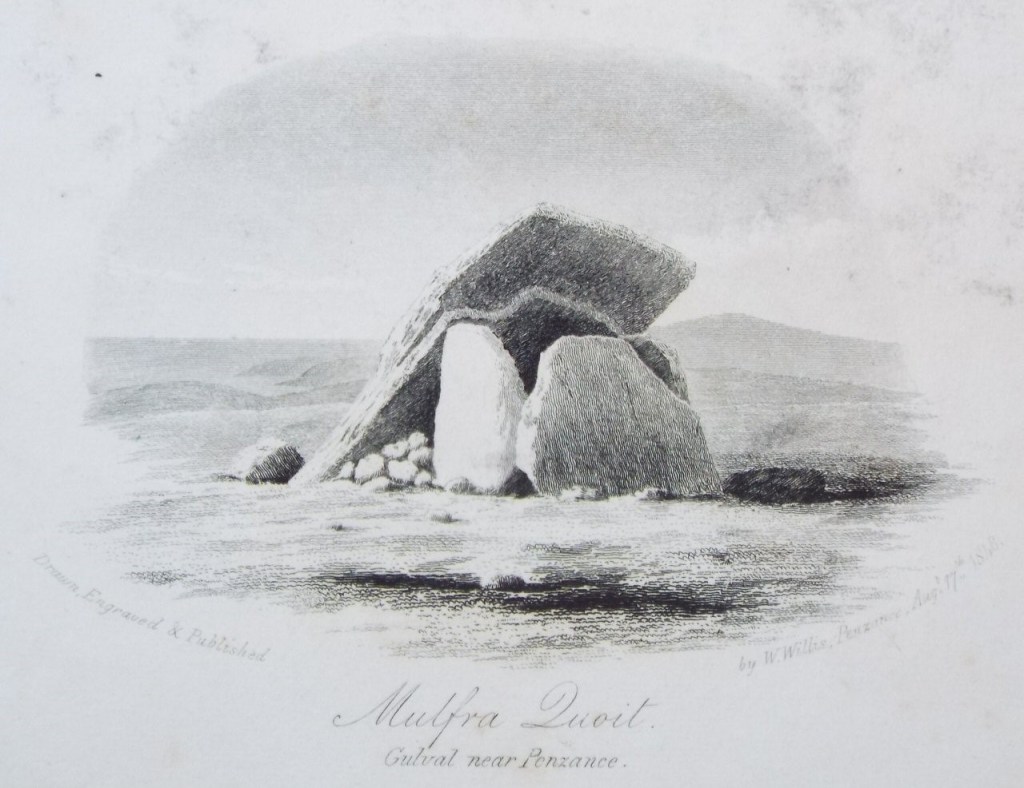 The author of the Land’s End District states that, he was informed that the date of its collapse was 1752, during a thunderstorm. He was, however, probably misled by an account published in the Philosophical Transactions of the year following, in which it is recorded that a “quoit” on Molfra Hill (meaning the highest stone of a natural pile of rocks, and often so called by the Cornish), had been struck by lightning in that year. Dr. Borlase visited the spot on the 23rd of October, 1749, and at that time the Cromlech was in precisely the same state as present. He says, “as this quoit is off from its ancient situation with one edge resting on the ground, I thought it might permit us safely to search the enclosed area.” Nothing of importance was discovered, and the Doctor only found that a pit had been sunk twenty inches deep in the area of the Kist-Vaen, and “that something which either was originally, or has since turned black, was placed in the bottom of it.”