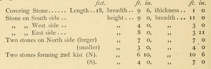 The following measurements of the stones which compose this Cromleh were taken on the 17th of February, 1872, and very closely accord with those obtained by the scale which accompanies the plan at page 53.-