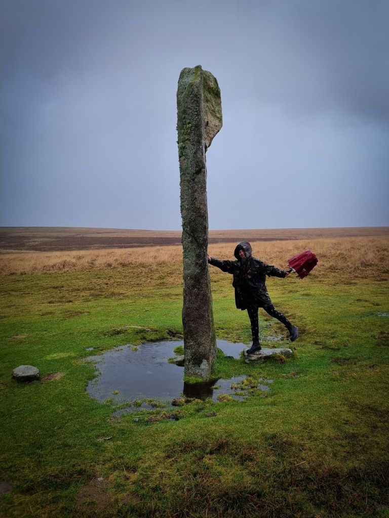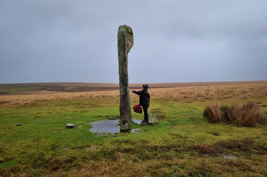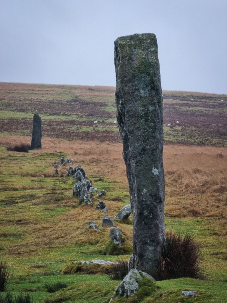 The elevation of the ground at Giants Basin is approximately 1,100 ft; and its gradient, falling from north-east to south-west is approximately 1 in 22. This is one of the few groups in which all parts can be seen from all parts, and perhaps this has had an influence on its symmetry.” – https://devonassoc.org.uk/devoninfo/worths-dartmoor-the-stone-rows-of-dartmoor/
