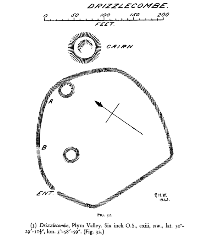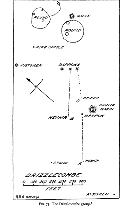 …It will be seen that the abreast of A on the plan is a standing stone. If a line be drawn from this stone to the north-westernmost of the three barrows below the pound, one then has a completely symmetrical collection of rows, and this may have been contemplated.